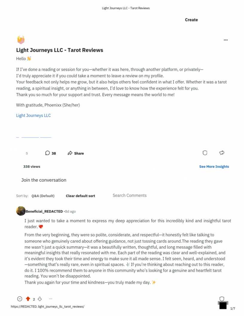 What sets Light Journeys LLC apart is the unwavering commitment I make to the individual spiritual journey of each client. I understand that every path is unique, and I strive to provide the tools & guidance, that will help to support your personal exploration and growth. The products are carefully curated for their quality and spiritual significance, and the readings are conducted from the heart by myself (Phoenixx) and I offer personalized insights. I hope that with Light Journeys you find a space to connect to your higher self and that you come away from this experience feeling supported and inspired. At Light Journeys LLC, I hope to be a partner on your spiritual light journey.
